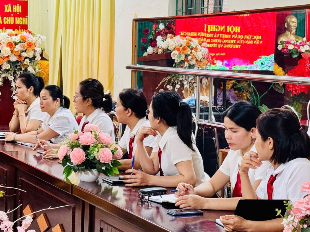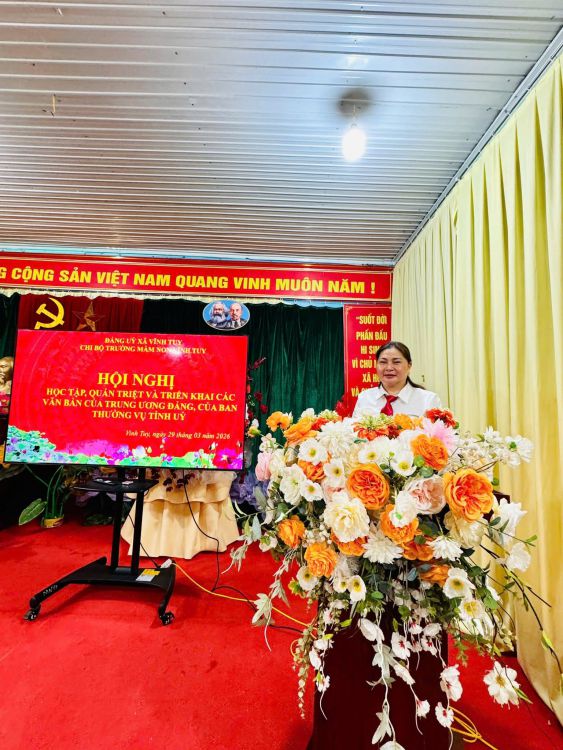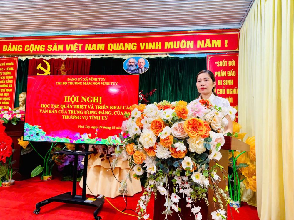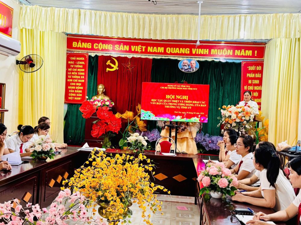 👉Nhằm kịp thời tuyên truyền, phổ biến và triển khai thực hiện hiệu quả các văn bản chỉ đạo của Trung ương, của Tỉnh ủy và Đảng ủy xã, Chi ủy Chi bộ Trường Mầm non Vĩnh Tuy đã tổ chức học tập, quán triệt đến toàn thể cán bộ, đảng viên, cán bộ quản lý, giáo viên, nhân viên trong nhà trường.